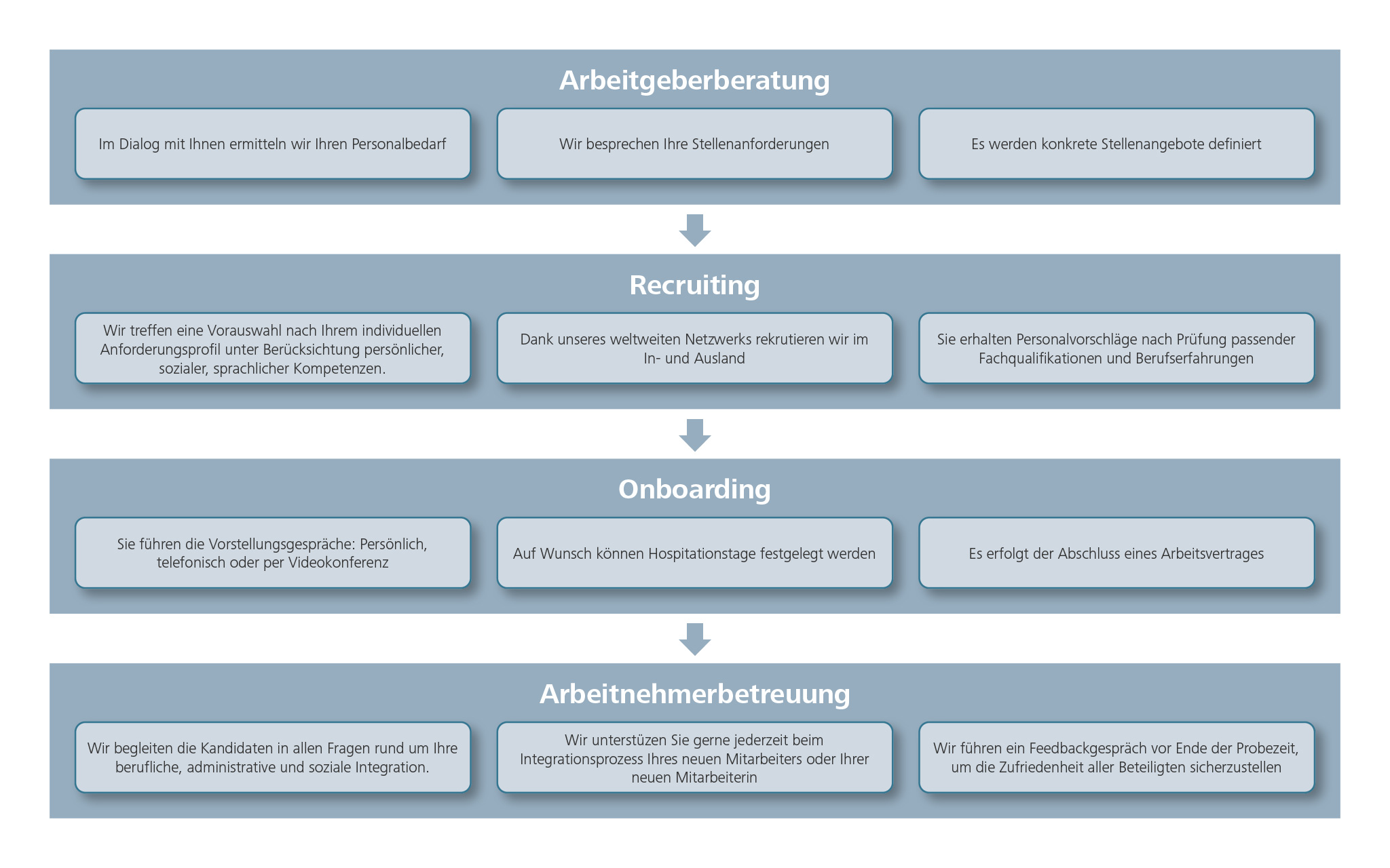 - Sie erhalten passende Personalvorschläge. Durch unser qualifiziertes Fachpersonal werden die Kandidaten nach Fachqualifikationen und Berufserfahrungen, sowie persönlicher, sozialer und sprachlicher Kompetenzen geprüft.