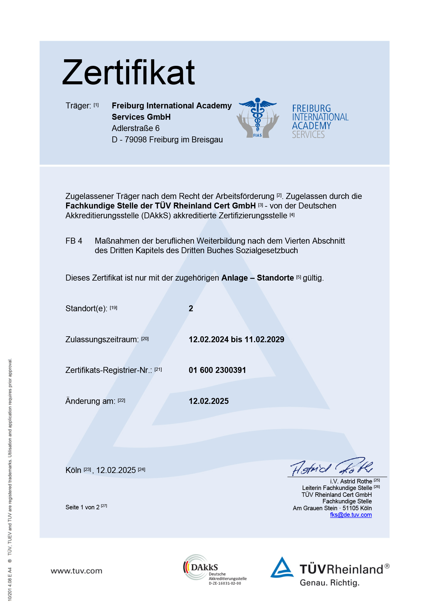 Der Freiburg International Academy Services wurde von der externen fachkundigen Stelle die AZAV-Zertifizierung verliehen.